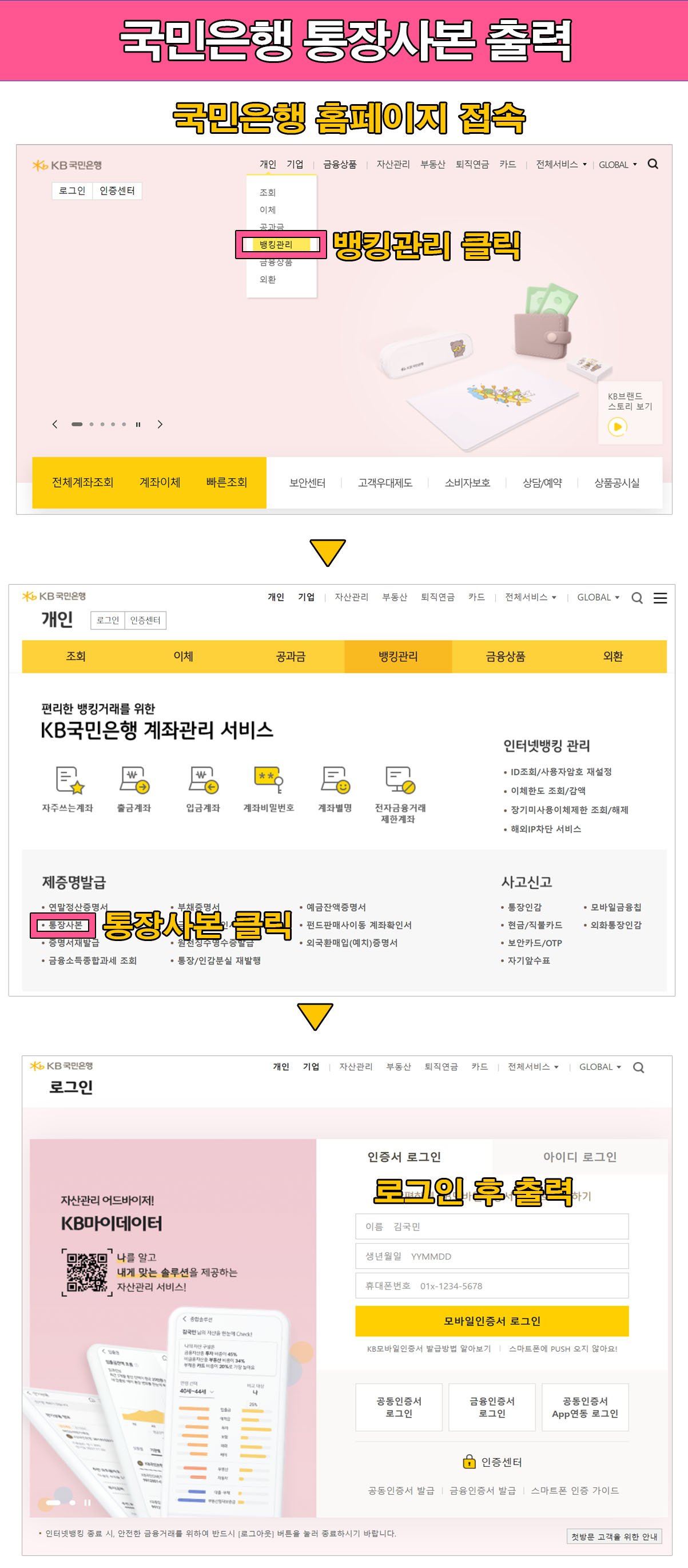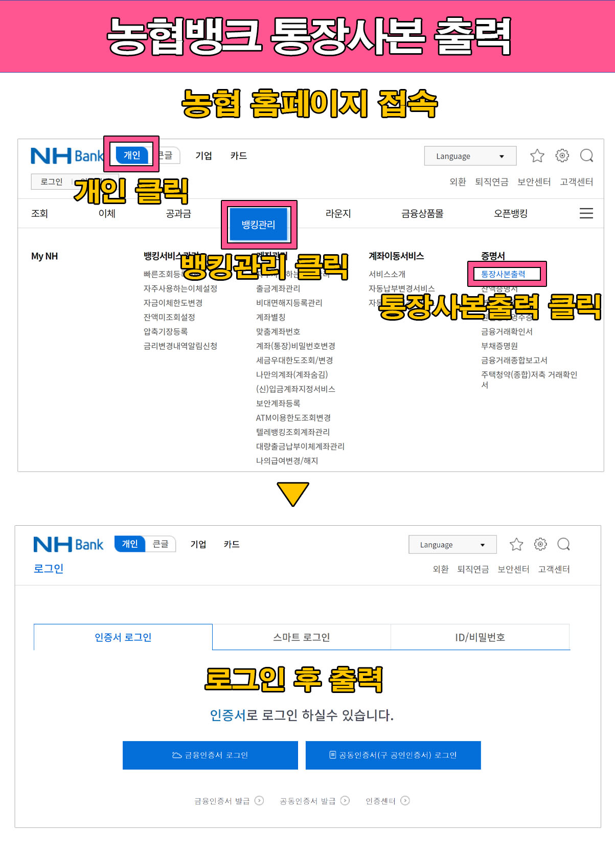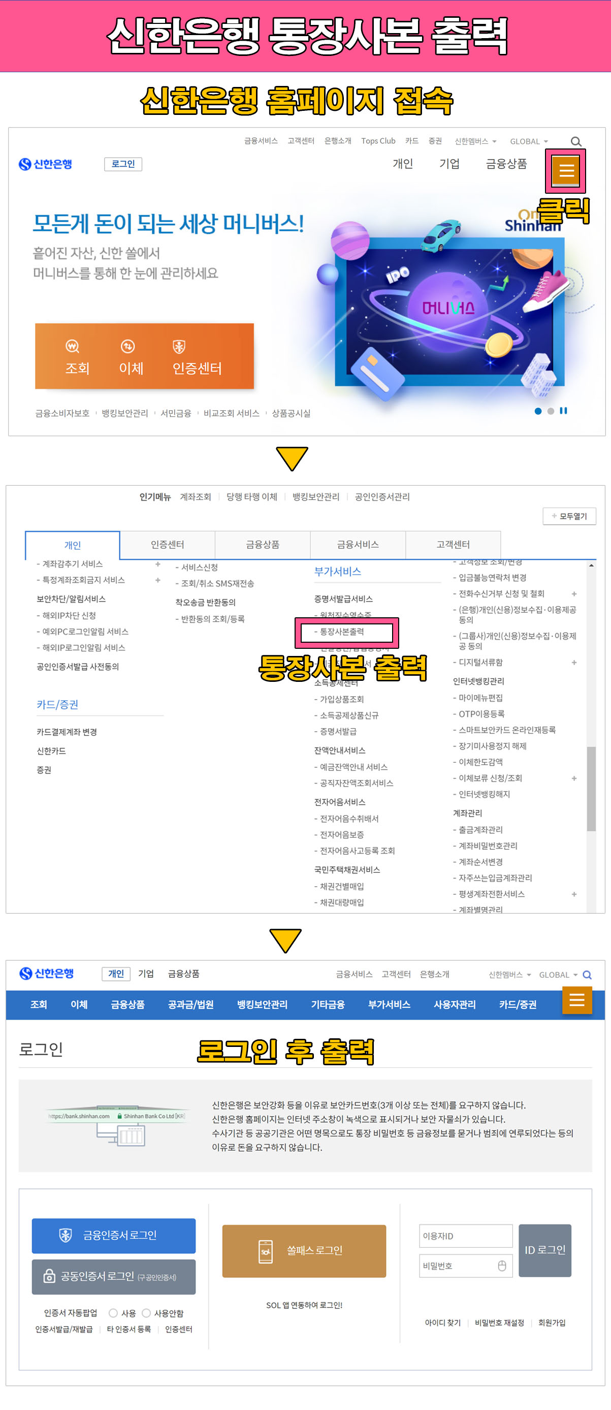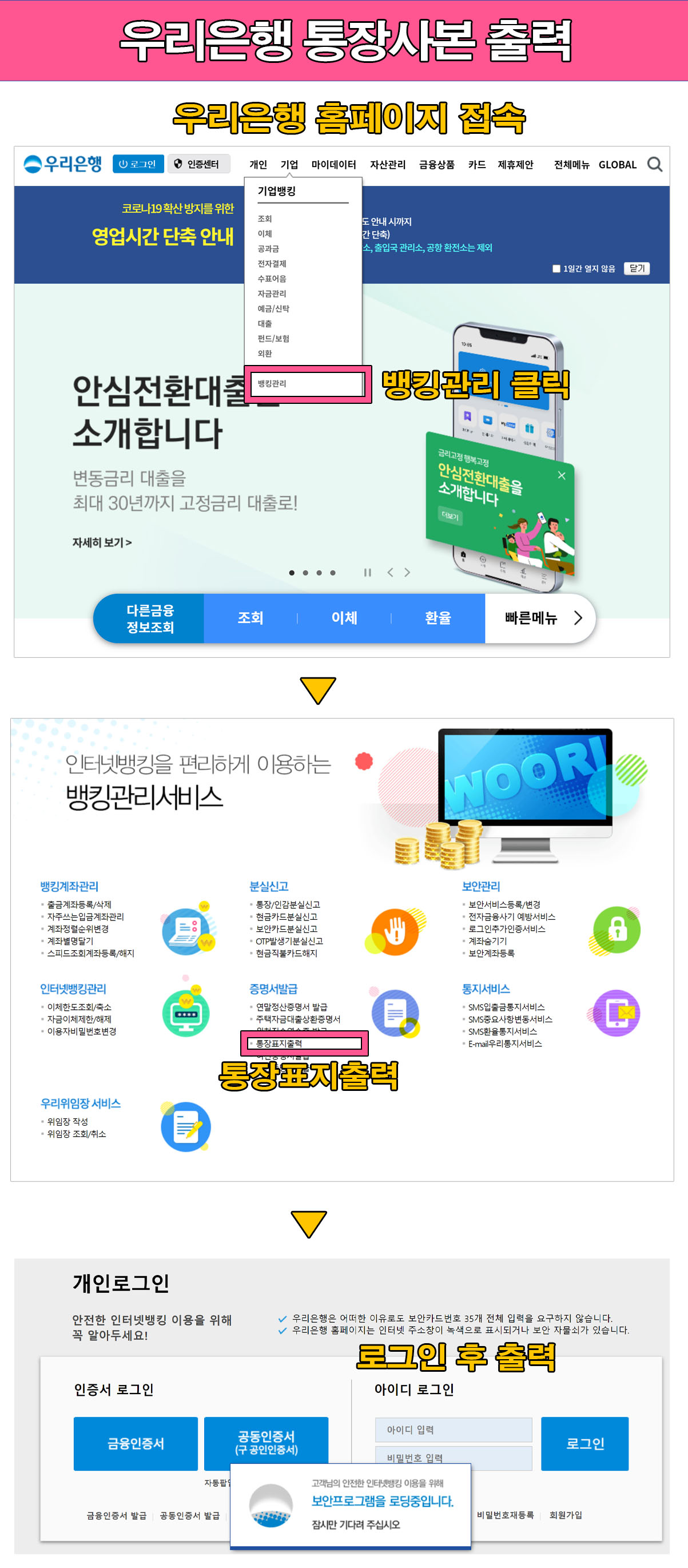 모든 은행 홈페이지의 공통점들은 공인인증서나 금융인증서 등으로 로그인을 해야 통장사본을 출력할 수 있다. 은행업무이기때문에 로그인은 필수이다. 요즘은 스마트 로그인 또는 간편인증 등 간단하고 편리하게 할 수 있기 때문에 어렵지 않다.