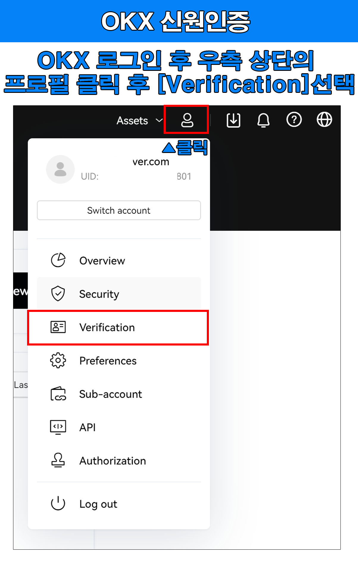 PC에서 오케이엑스 거래소에 로그인을 한 다음 우측 상단의 프로필 모양을 클릭하면 세부 탭에서 [Verification]를 선택하여 kyc인증을 진행하면 된다.