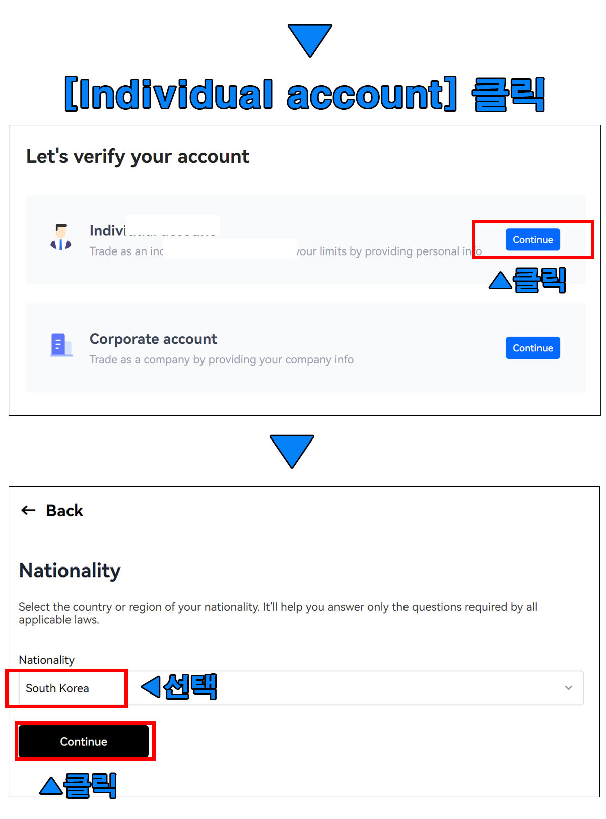 기업회원이 아닌 개인회원의 신원인증을 진행하면 된다. [Individual account]탭에 있는 [Countinue]박스를 클릭하여 kyc인증을 진행한다.