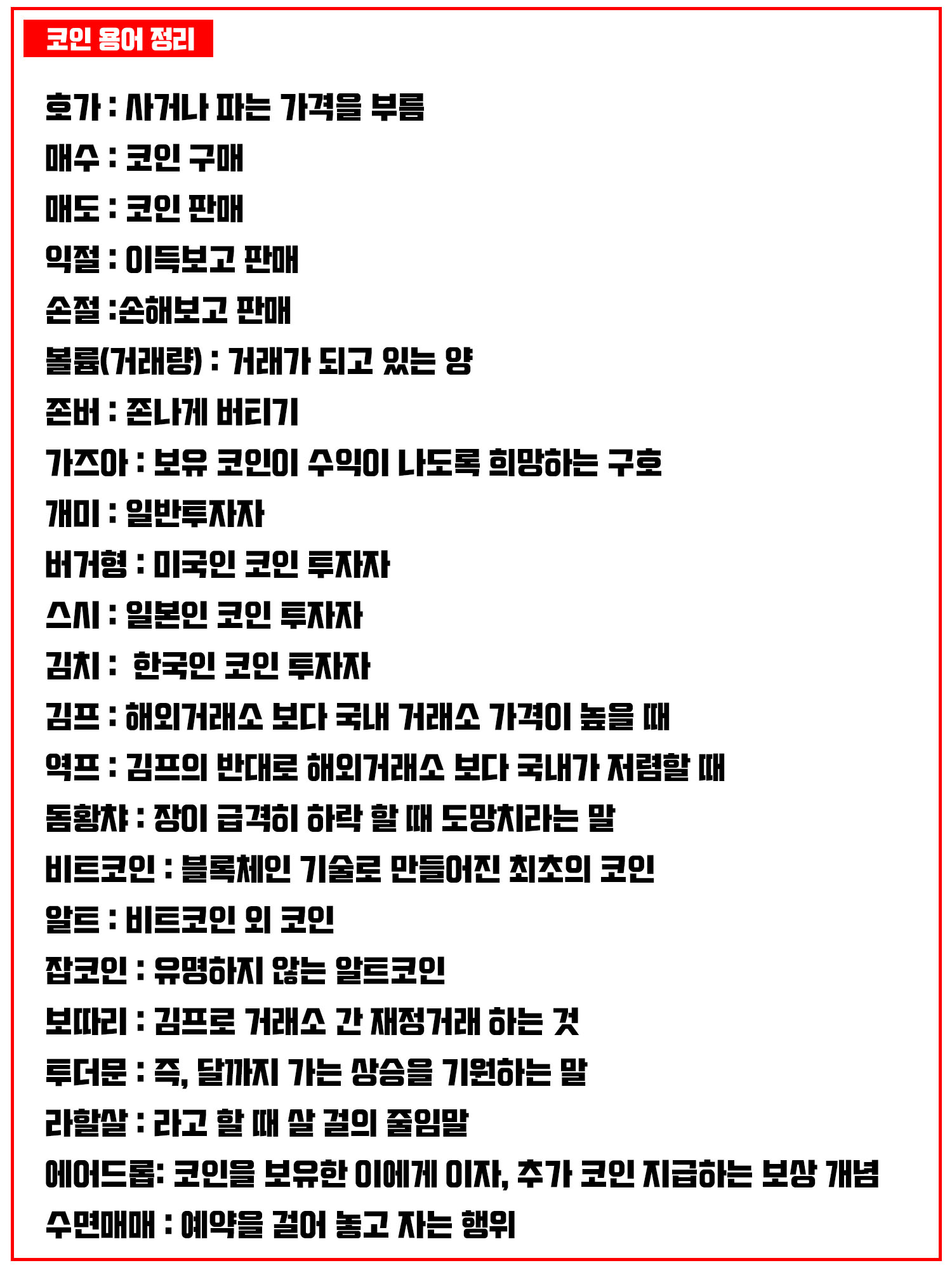 코인 용어에 대해 알고 있으면 거래를 할 때 나름 도움이 되므로 가장 기본적인 "가즈아 ~~~~~~~~" 부터 자주 접했던 단어와 생소한 단어들까지 생각나는대로 적어보았다.