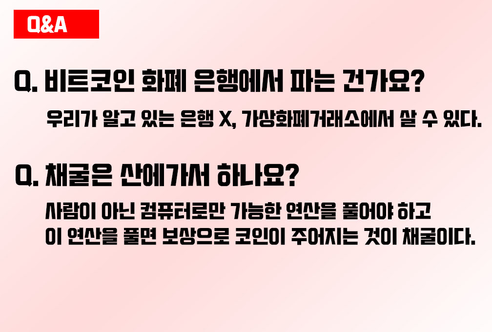 비트코인을 움직이는 블록체인 기술은 사용자의 모든 거래 기록을 모든 사용가 함께 보관하는 것이 원칙이고 이때 복잡한 수학공식이 필요한데 사람이 아닌 컴퓨터로만 가능한 연산이고 이 연산을 풀면 새로운 블록을 만든느 사용자에게 보상으로 코인을 주어짐 이것이 바로 채굴이다.