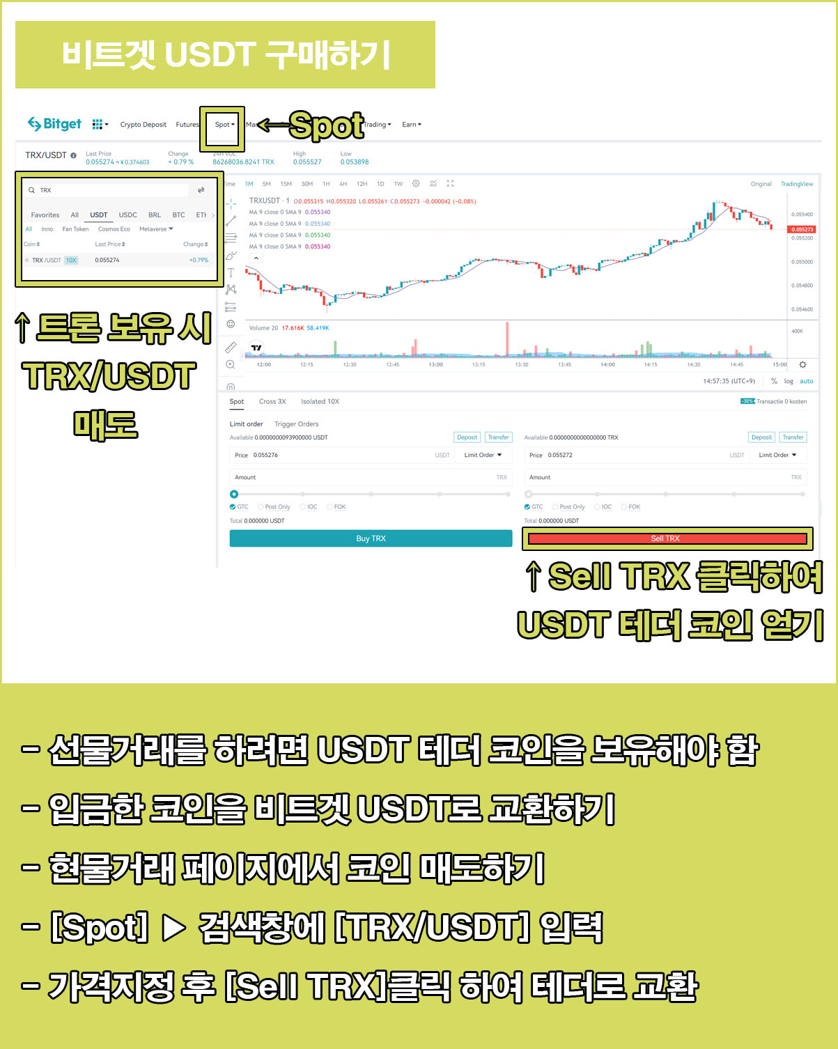 현물거래 페이지 [Spot]을 클릭한 후 좌측 검색창에 보유하고 있는 코인, 예시로는 트론(TRX)을 진행하였고 TRX/USDT를 입력하여 검색한 후 매도하면 된다. 판매 즉시 USDT테더로 교환된다.