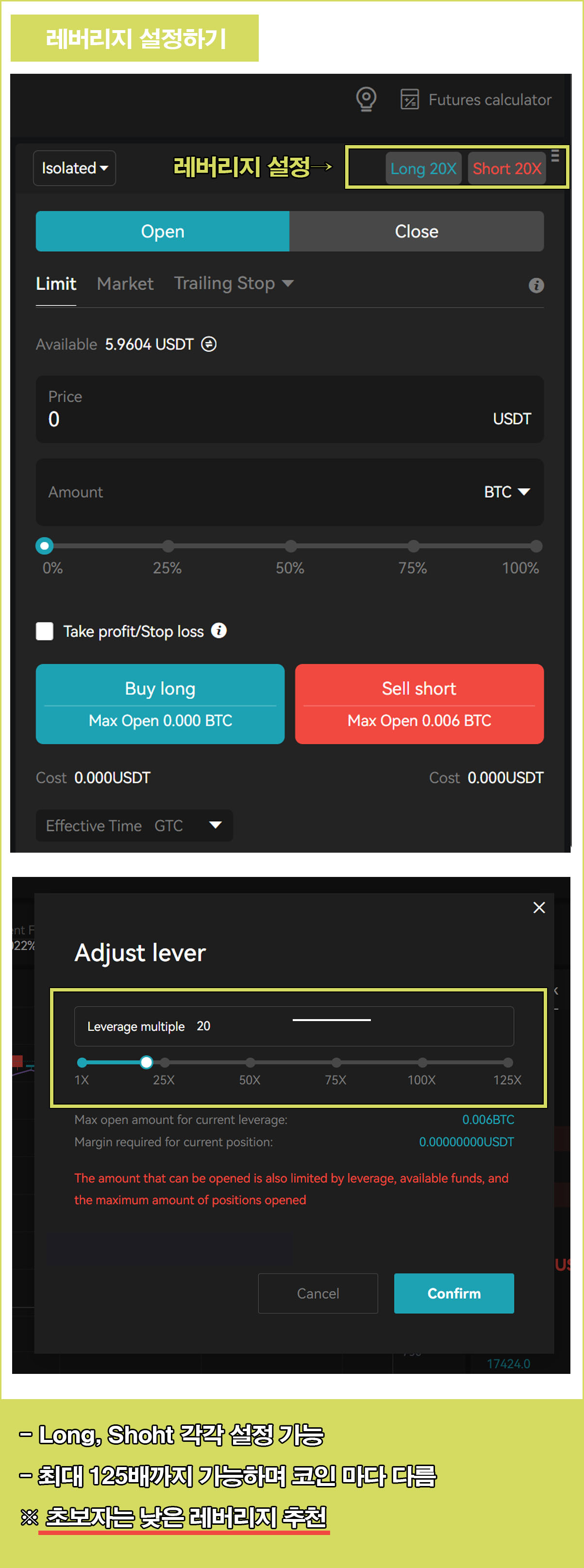 레버리지는 조정이 가능하고 최대 125배도 가능하지만 코인마다 최대 레버리지는 각각 다르다. 롱과 숏 각각 설정이 가능하고 높은 레버리지를 설정한 만큼 수익률도 크지만 손실도 크다는 점 주의하고 초보자의 경우 경험이 적기 때문에 저배율 레버리지를 추천한다.