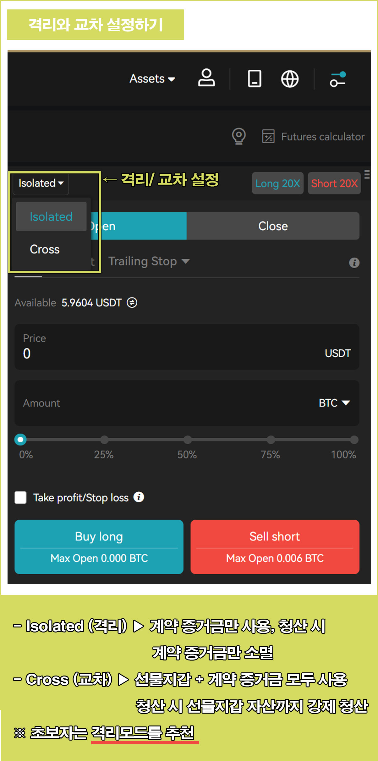 - Isolated (격리) ▶ 계약 증거금만 사용, 청산 시 계약 증거금만 소멸된다.