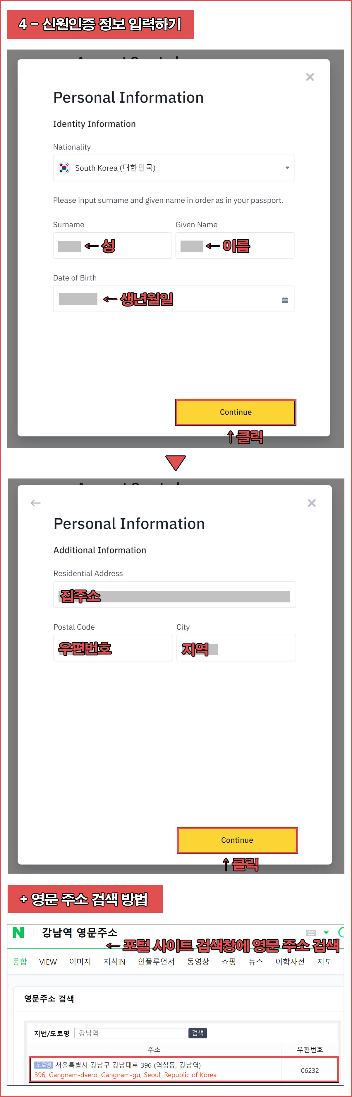 거주국가는 [South Korea- 대한민국]을 선택한 후 [Continue]를 클릭한다.