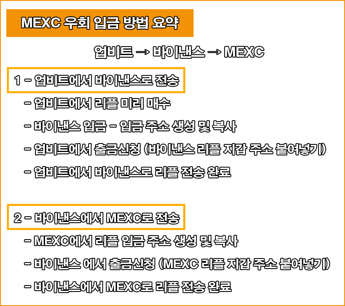 여기까지 MEXC 입금 방법에 대해 알아보았다. 우회하는 방법에 대해 어려움을 느끼는 분들에게 도움이 되었으면 한다. 어렵게 생각할 것 없이 업비트에서 바이낸스로 출금 → 바이낸스에서 MEXC로 출금 =(MEXC입금) 순서로 진행하면 출금 속도는 굉장히 빠른 편이기 때문에 초보코인가이드 입금 가이드맵만 잘 읽어본다면 속전속결로 진행할 수 있다.