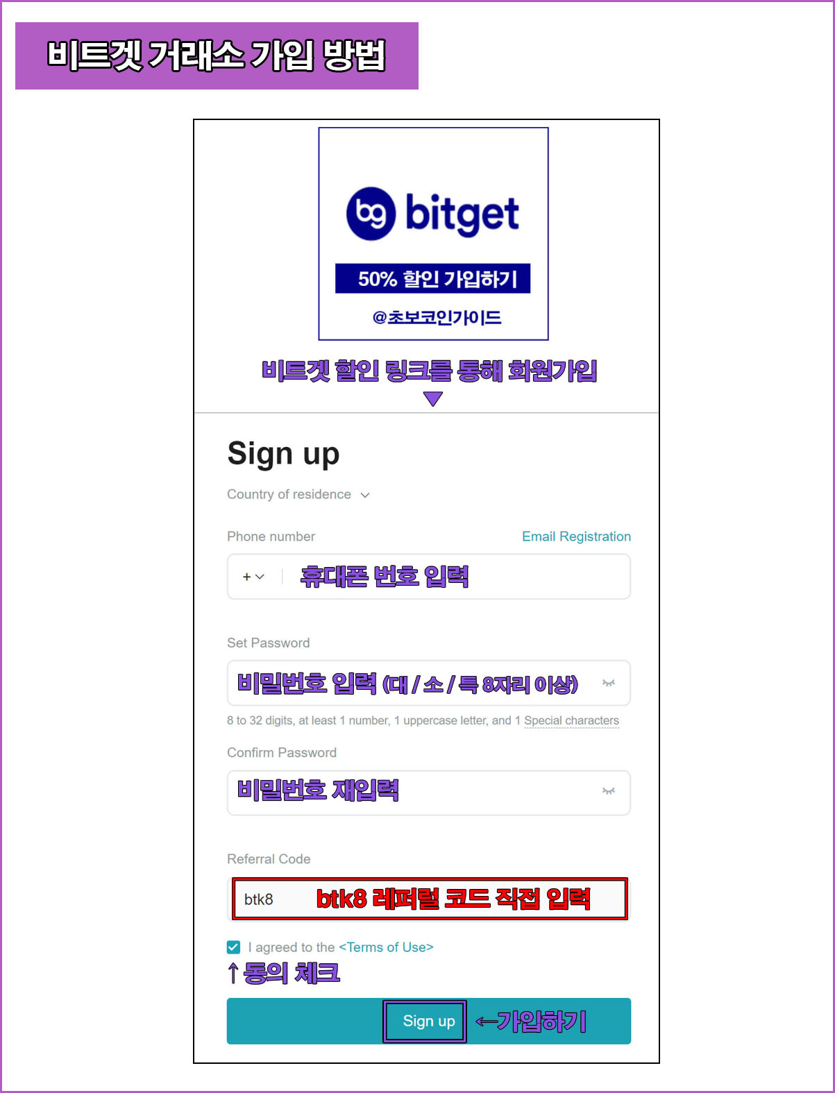 초보코인가이드 공식 레퍼럴 링크를 클릭하여 가입창으로 이동한 후 휴대폰 번호 또는 이메일 주소 중 선택하여 입력하고 비밀번호 설정 후 비밀번호 한번더 확인하고 그 다음 레퍼럴 코드 "btk8"을 입력하고 동의함에 체크한 후 가입하면 된다.