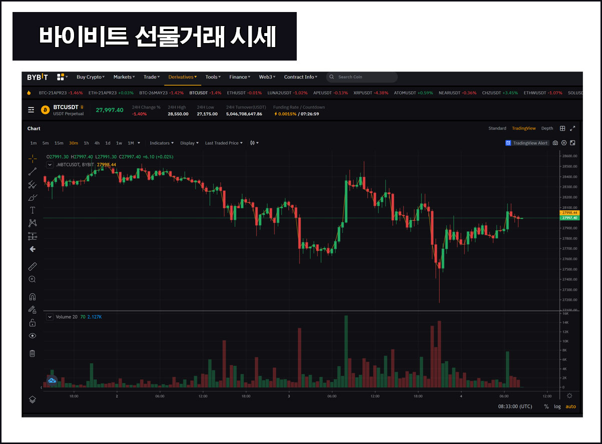 바이비트 선물거래는 29k 까지 상승했다가 26k까지 조정 받았다. 비트코인시장이 계속된 하락, 약세장이면서도 상승흐름이 지속적으로 유지되자 선물거래 인기가 더욱 높아졌다.