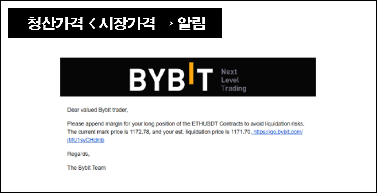 청산가격보다 시장가격이 높아지면 메일 혹은 문자로 마진콜이 발생하게 된다. 이 때 마진콜이 발생한 후 추가 증거금을 넣지 않으면 즉시 포지션이 청산되고 이메일이나 문자로 청산내역을 받게 된다.