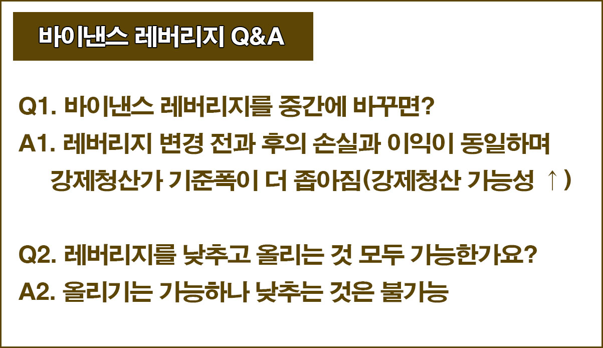 A1. 레버리지 변경 전과 후의 손실과 이익이 동일하며 강제청산가 기준폭이 더 좁아짐(강제청산 가능성 ↑)
