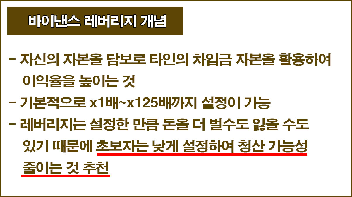 ※ 초보자는 고배율의 레버리지를 추천하지 않으며 고배율 레버리지 설정 시 청산의 위험성이 크다는 것을 주의해야한다.