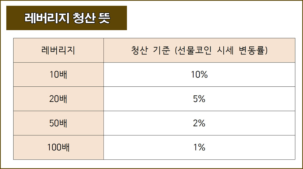 레버리지 청산의 간단한 계산 방법은 위와 같다. 쉽게 말하면 레버리지 X 코인 시세 변동률이 100%가 초과하는 경우 청산된다.