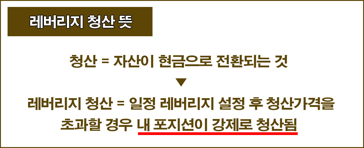 청산은 자산이 현금으로 전환되는 것을 뜻하며 레버리지 청산은 일정 레버리지를 설정 후 청산가격을 초과할 경우 내 포지션이 강제로 청산되는 것을 뜻한다.