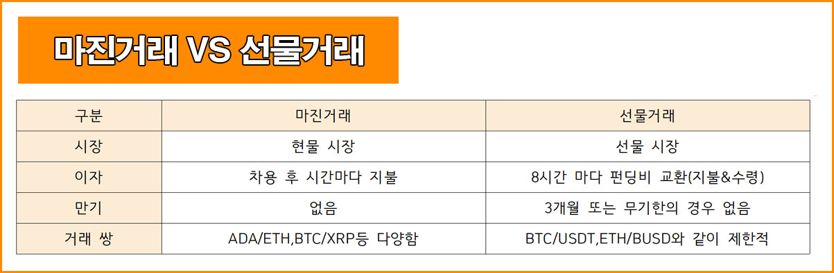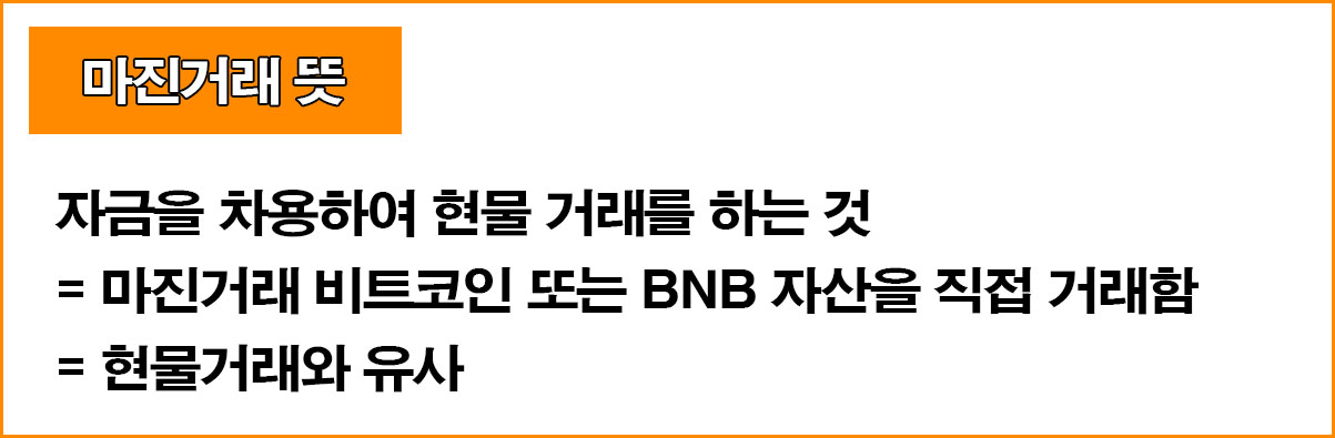 마진거래는 자금을 차용하여 현물 거래를 하는 것으로 마진 거래 비트코인, BNB 자산을 직접 거래하는 점은 현물거래와 유사하다. 마진거래는 자금을 차용하여 레버리지를 사용한다는 점이 현물거래와 다른점이다.