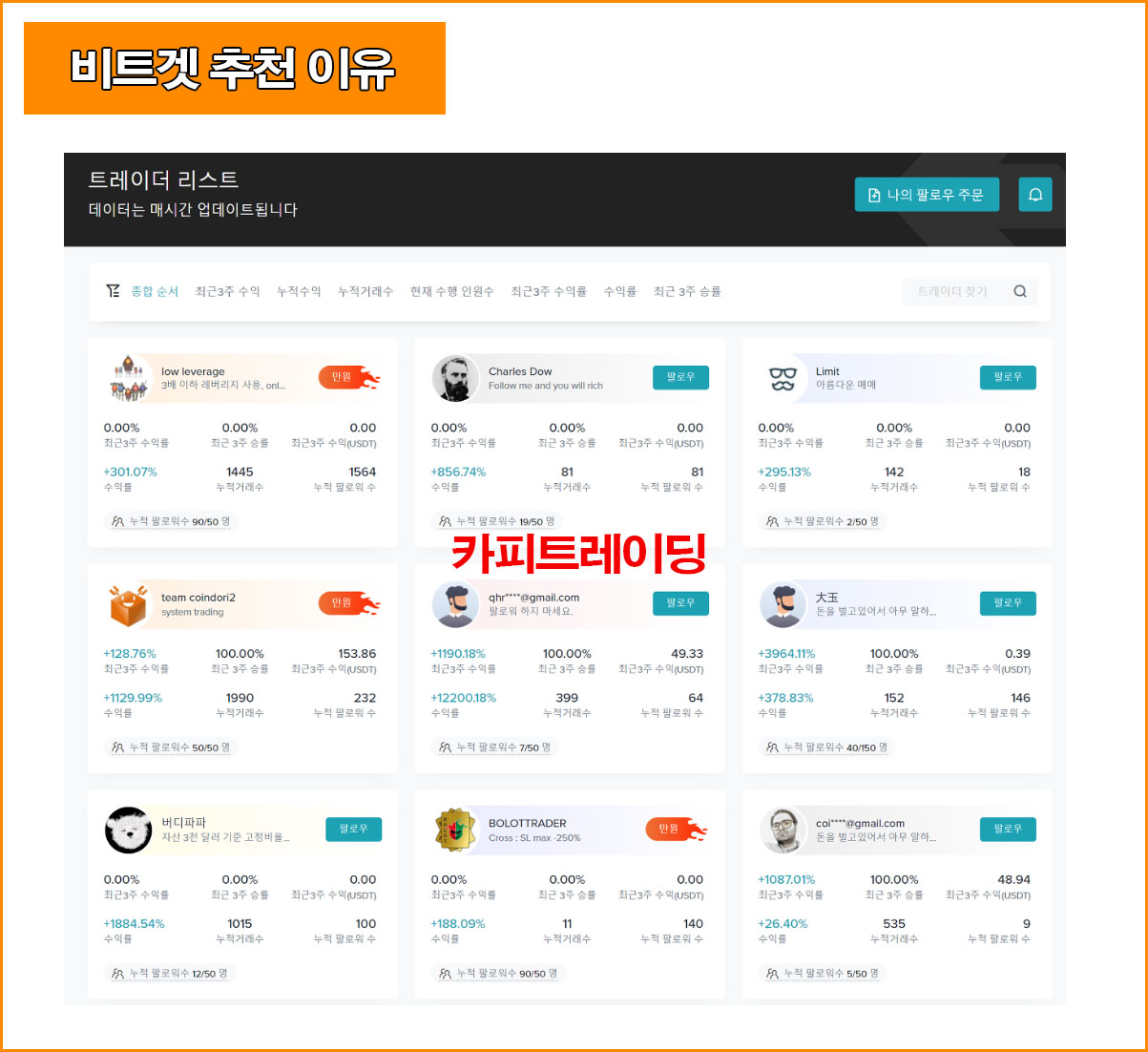 여기서 카피트레이딩은 비트겟하면 떠올리는 대표적인 인기 플랫폼이며 실제로 선물거래를 이용자보다 카피트레이딩 이용자가 더 많다.