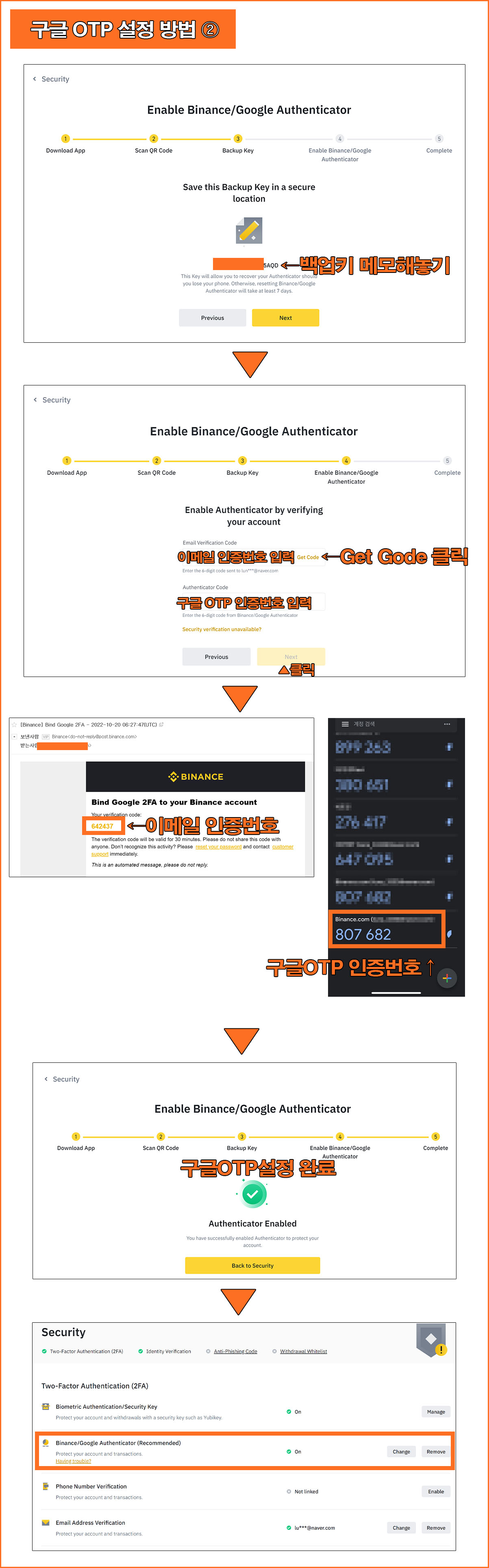 마지막으로 이메일 인증번호 6자리와 구글OTP 인증번호 6자리를 입력해야한다. 이메일 인증코드는 Get Code를 클릭하여 메일을 수신하도록 해야한다. 자신의 메일함을 확인하여 인증번호를 가져오고 구글OTP 앱을 실행하여 바이낸스 인증코드를 확인 후 화면에 입력한다.