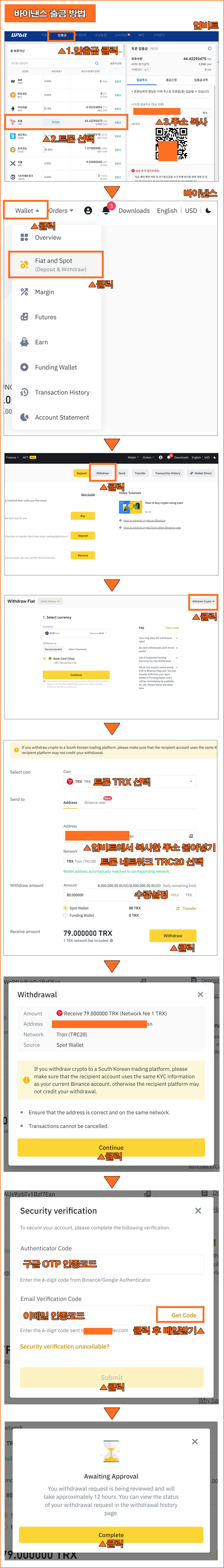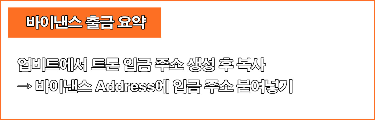 국내거래소에서 트론 입금주소를 생성하여 복사한 후 바이낸스에 로그인하여 출금창에서 업비트에서 복사해온 입금 주소를 붙여넣고 출금신청을 진행하면된다.