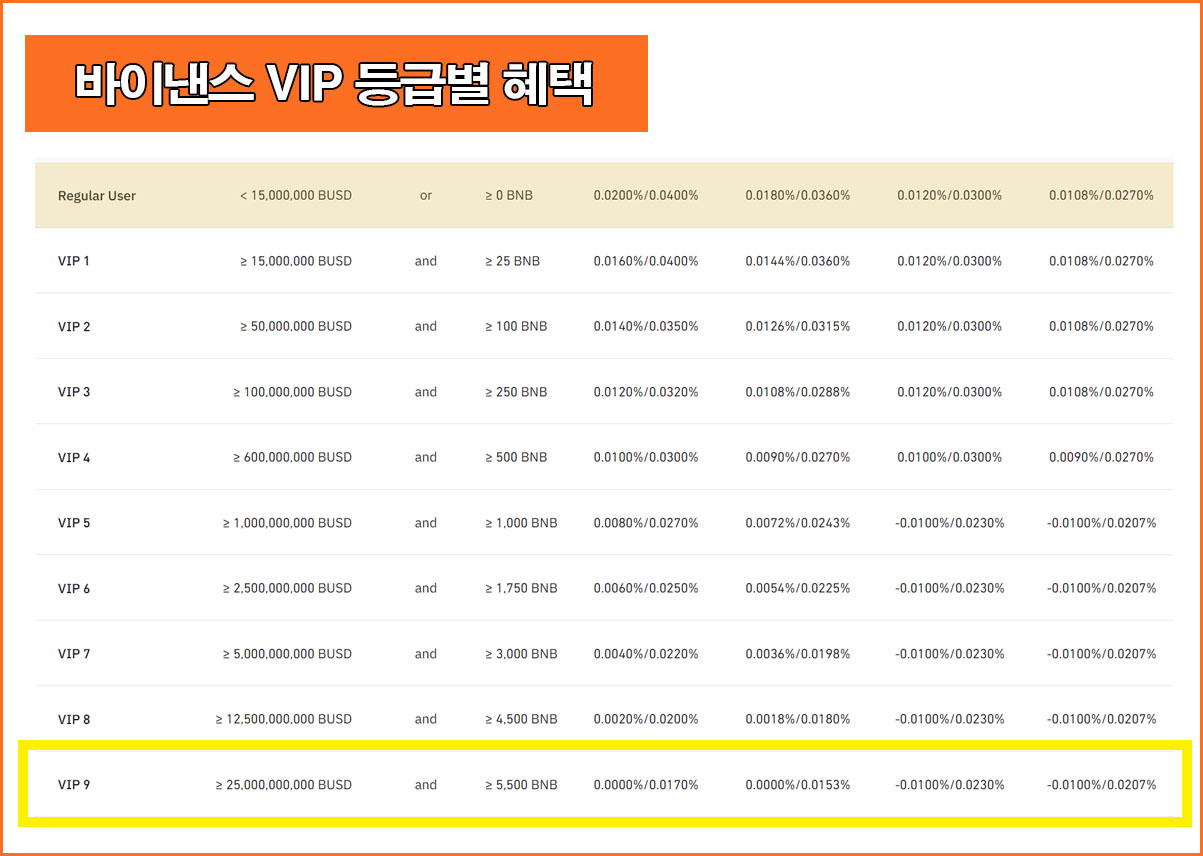 바이낸스는 VIP 등급별로 할인 혜택이 차등 적용 된다. VIP 최고 등급인 VIP9에 달하면 지정가 수수료는 0%에 이용할 수 있다.