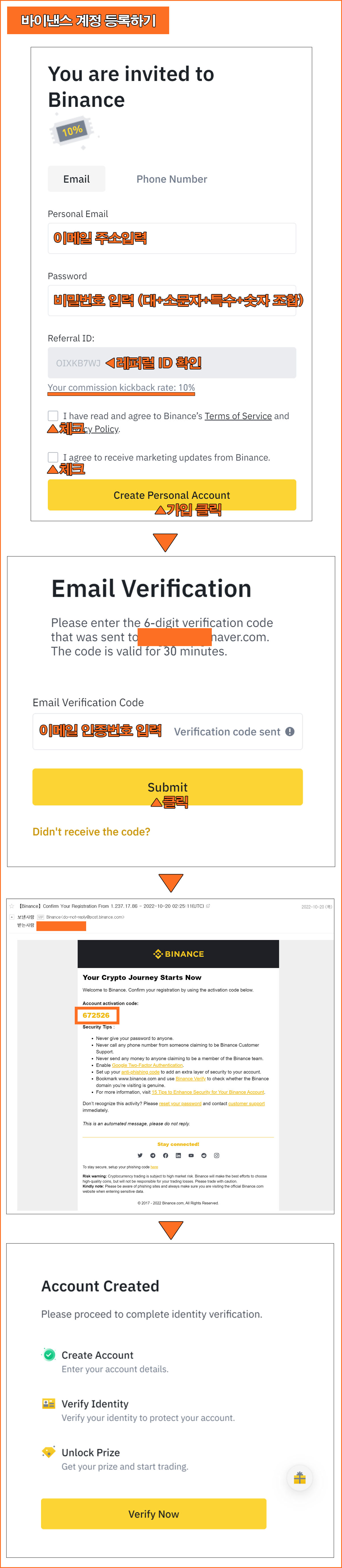 이메일 주소를 입력하고 비밀번호 (대+소문자+특수+숫자 조합) 입력 후 레퍼럴 ID에서 OIXKB7WJ를 입력하고 수수료 할인 비율 10%를 확인 후 동의사항에 체크 후 Create Personal Account를 클릭하여 가입한다.