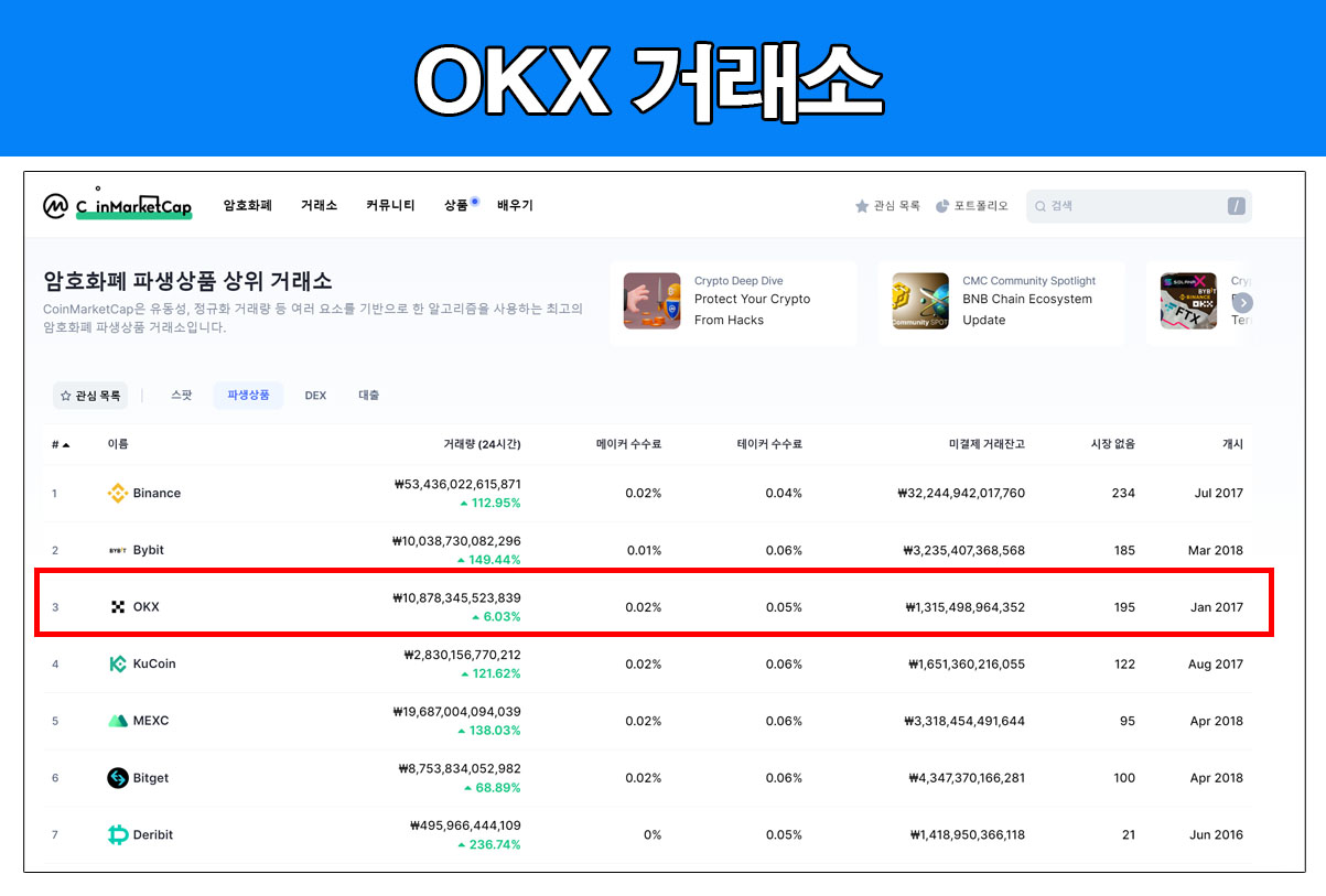 거래량이 많은 메이저 거래소를 이용해야 하는 이유는 바로 안전성때문이다. 파생상품 부분 1위는 바이낸스, 2위는 바이비트, 3위는 OKX이다.