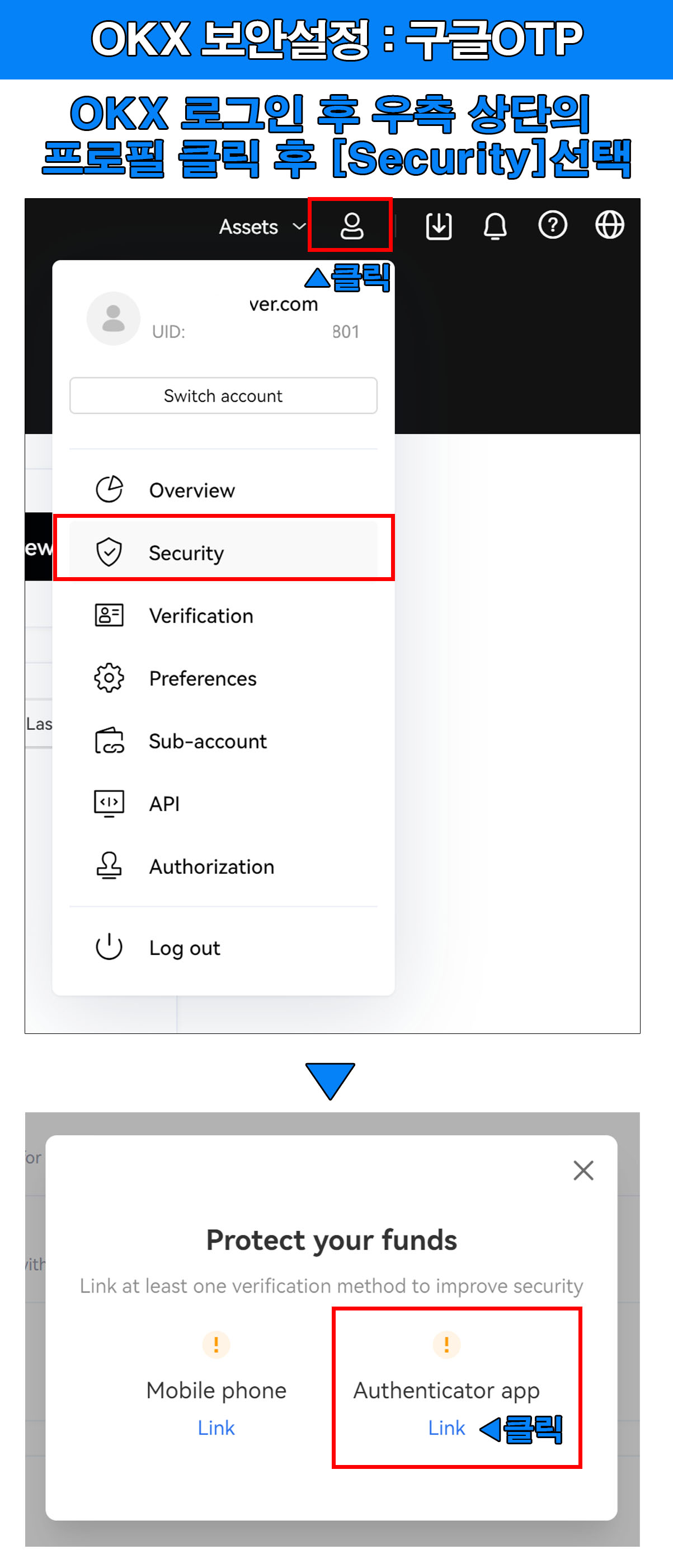 로그인 후 우측 상단의 프로필 모양을 클릭한 다음 [Security]를 클릭한다. 작은 창이 나타나면 [Authenticator app]를 선택한다.