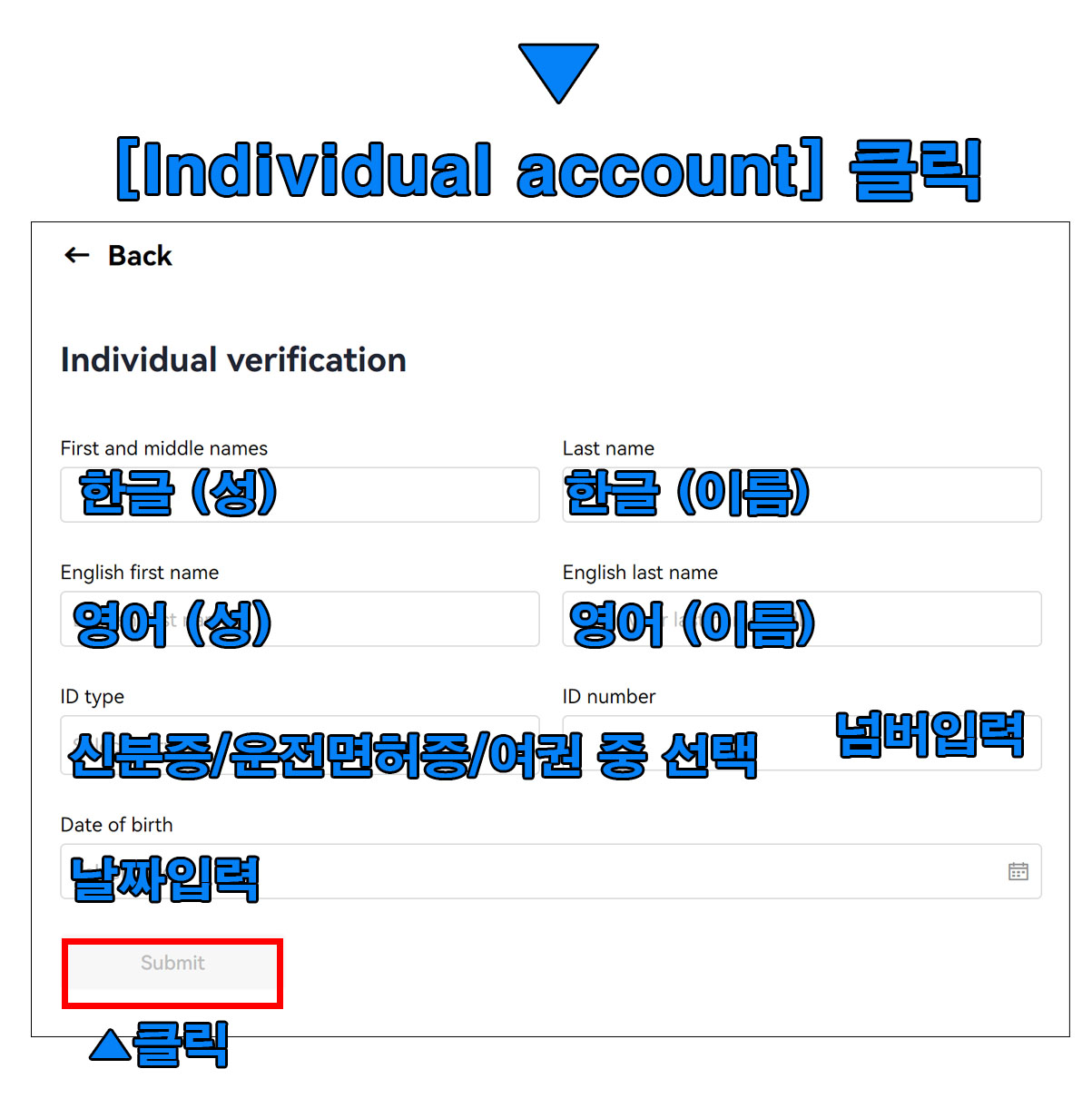 기업회원이 아닌 개인회원의 신원인증을 진행하면 된다. [Individual account]탭에 있는 [Countinue]박스를 클릭하여 kyc인증을 진행한다.