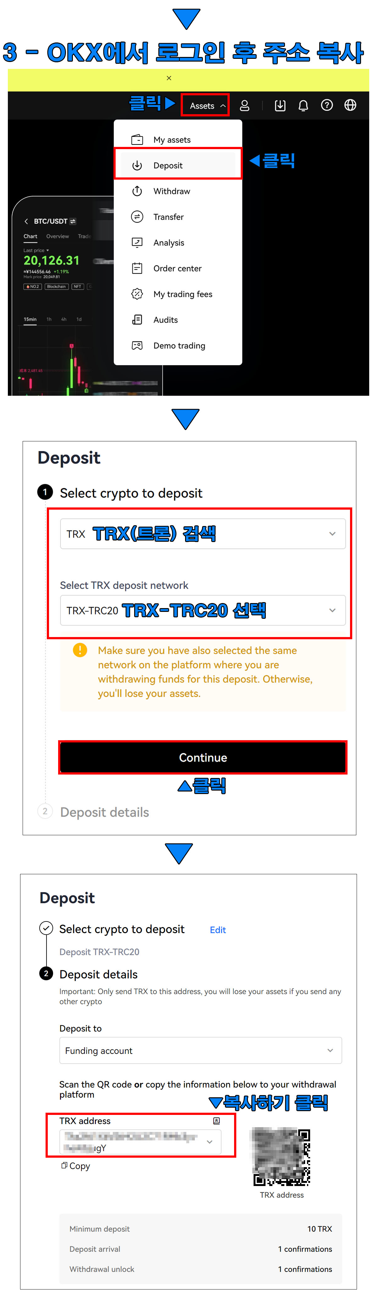 OKX에서 로그인 후 우측 [Assets]의 하부탭에서 [Deposit]를 클 릭후 Select crypto deposit에서 코인은 [TRX]-트론을 검색하고 네트워크는 [TRX-TRC20]을 선택한 다음 [Continue]를 클릭한다. 그 다음 나타나는 창에 OKX의 트론 주소가 생성되는데 복사를 한 후 다시 업비트 홈페이지 창으로 넘어간다.
