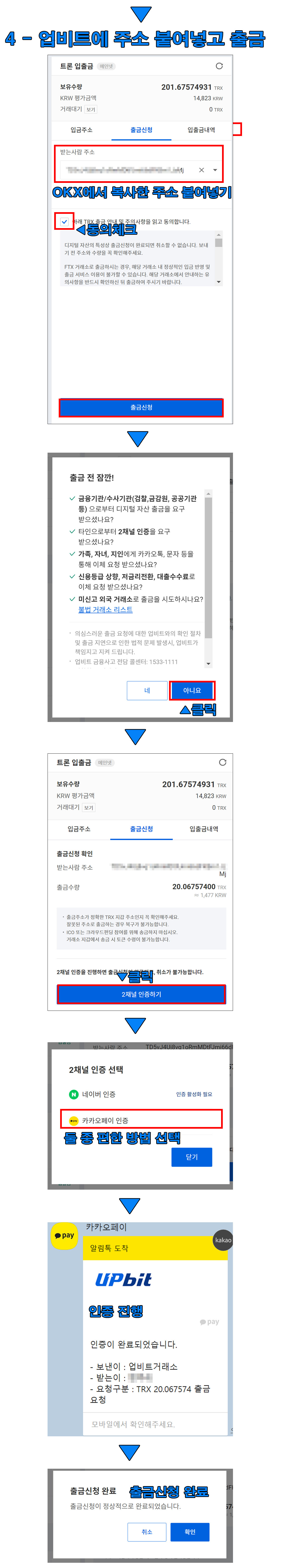 두번째 창에서는 출금할 주소를 입력하라는 내용인데, 이창을 켜논 상태에서 업비트에 접속한 후 로그인 후 입출금탭에서 트론을 선택하여 [입금]을 클릭하면 업비트의 트론 입금 주소가 나타난다. 이 주소를 복사한 후 다시 오케이엑스 거래소의 출금 창에 붙여넣기를 한다.