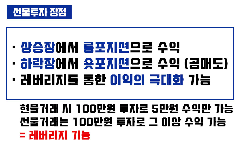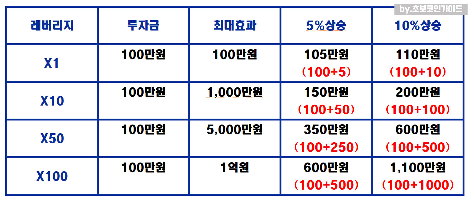 표를 보면 레버리지 투자시 숫자별 최대효과에 대해 설명하였다. 예를들어 코인이 5%의 상승 변동이 있을 경우 현물은 5만원의 수익만 가능하고, 선물거래는 내가 설정한 효과만큼 가능하니 100만원 이상의 수익이 가능하다.