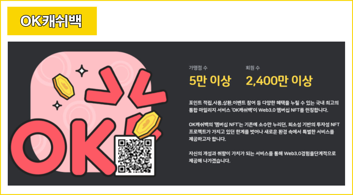 대한민국 국민이라면 OK캐쉬백을 모르는 분들은 없을 것이다. 국내 최대 규모의 마일리지 서비스로 백화점, 식료품점 등등 가맹점만 5만 이상이기 때문에 아주 대중적인 서비스로 자리 잡았다.