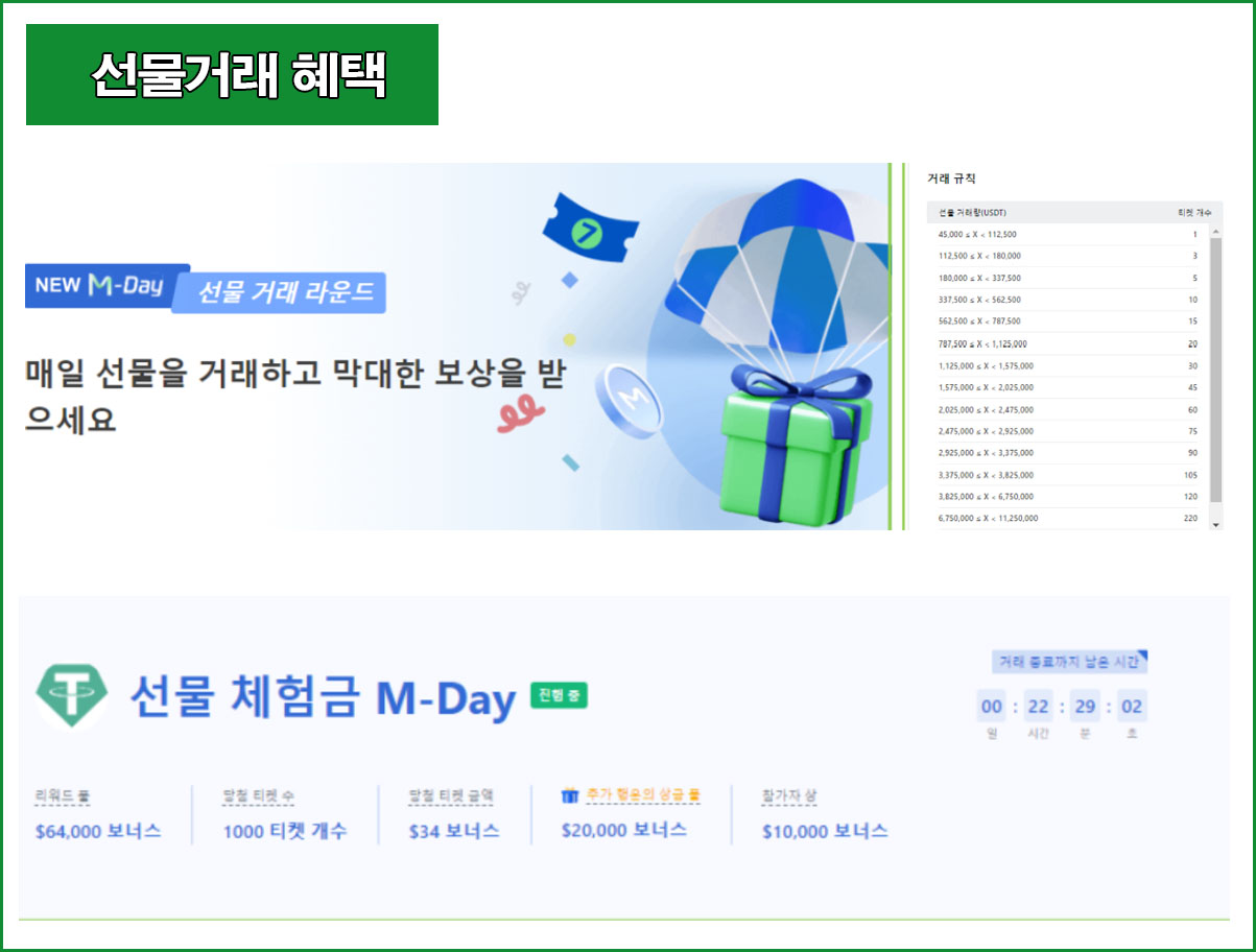 현재 멕스씨는 선물 체험금 M-DAY 이벤트를 진행하고 있고 선물 거래를 많이 하면 할수록 티켓을 제공한다. 선물 거래량은 최소 45,000USDT부터 시작하여 거래를 많이 할수록 위의 표처럼 티켓을 더 준다.