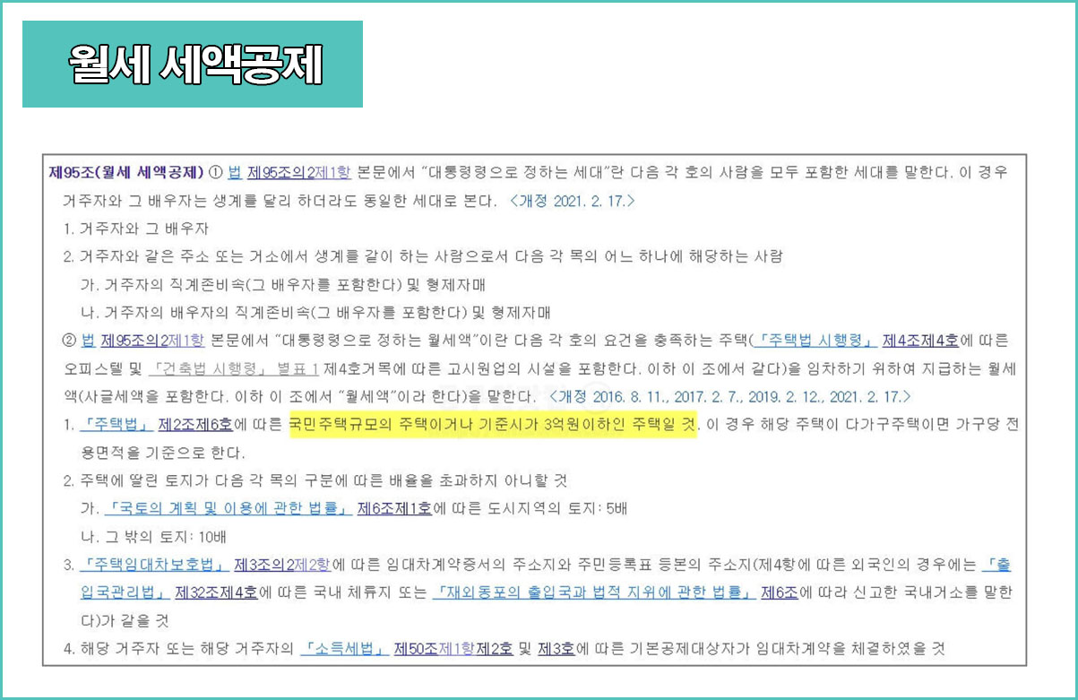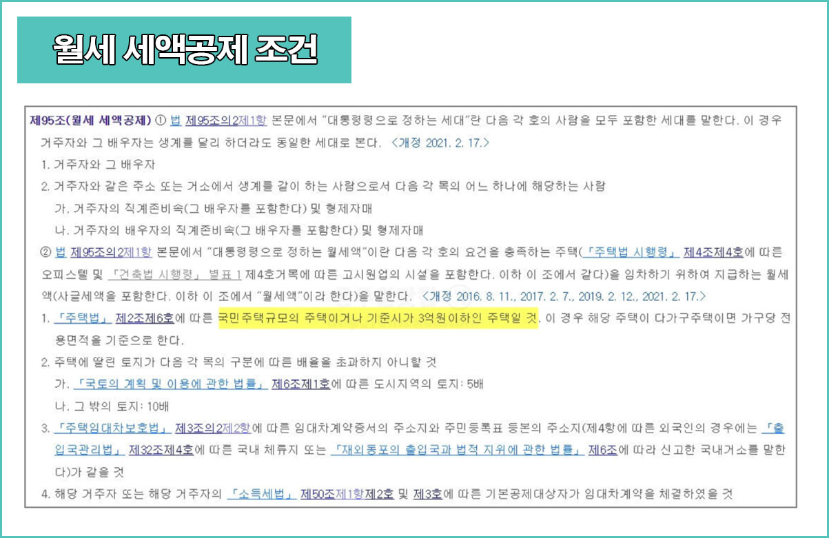 3. 주거용 오피스텔(2013.8.13. 이후 최초로 월세액을 지급하는 분부터 공제가능), 고시원(2017년 귀속 연말정산분부터 고시원에 대한 월세액도 요건을 충족하는 경우 공제가능)을 포함한 주택. 2019년부터는 국민주택규모(85㎡ 이하)의 주택이거나 기준시가 3억원 이하 (국민주택규모 초과 주택이더라도 기준시가 3억원 이하 주택 임차시에는 공제가 가능)