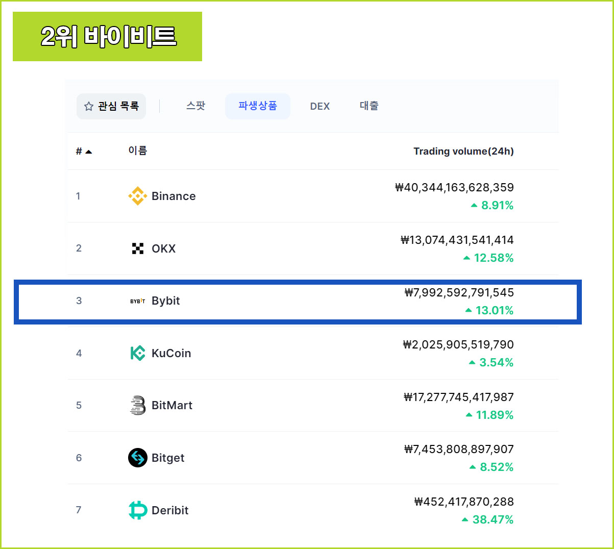 2위는 바이비트로 수수료가 굉장히 저렴한 거래소로 파생상품 전문 거래소이다. 지정가 수수료가 저렴하기 때문에 스윙이나 단타를 원하시는 분들이 이용하면 좋다.