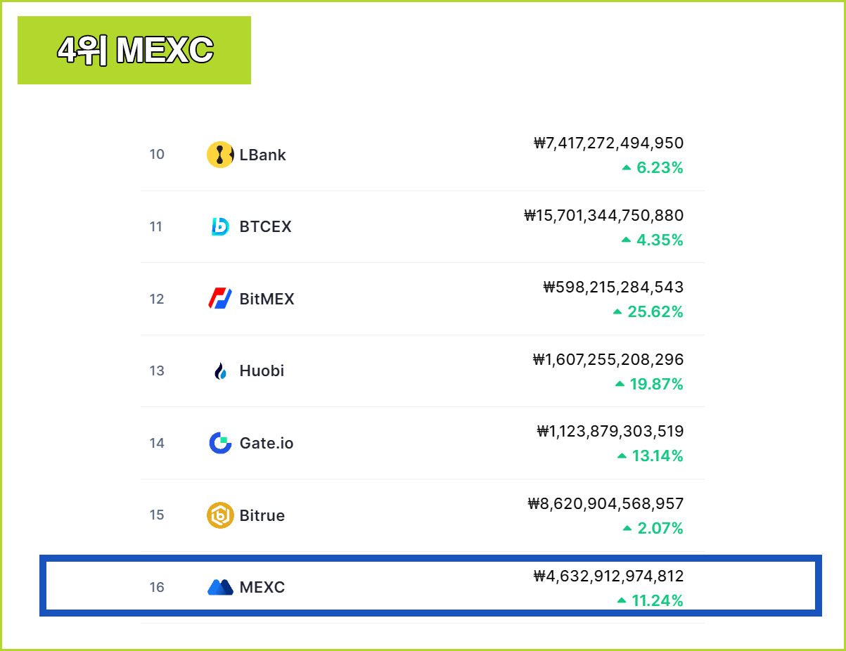마지막 4위는 MEXC로 코인마켓캡 기준 16위를 유지하고 있다. 유일한 한글 지원 거래소로 인기가 많으며 떠오르는 거래소이다.