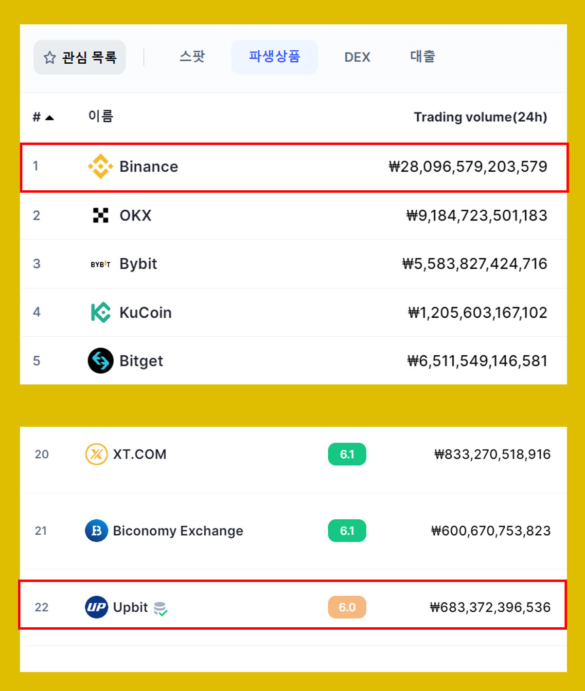 바이낸스는 메이저 1위답게 거래량 1위이다. 2위와의 격차도 엄청난 곳이다. 업비트의 경우도 바이낸스보다 거래량이 덜 발생하지만 국내 이용자들만 이용한다는 점을 고려하면 거래량이 많은 편이다. 둘은 같은 선상에서 비교할 수 없게 국내 이용자와 세계 이용자로 나뉘기 때문이다.