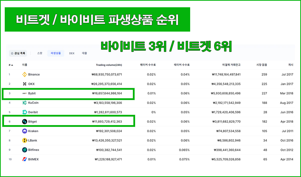코인마켓캡 파생상품 선물거래소 중 상위권 메이저 거래소 중 비트겟과 바이비트가 있다. 2018년도에 시장에 출범했다는 점이 같으며 본사도 싱가폴로 동일한 위치ㅋ이다. 순위로 보면 바이비트가 3위, 비트겟이 6위이다.