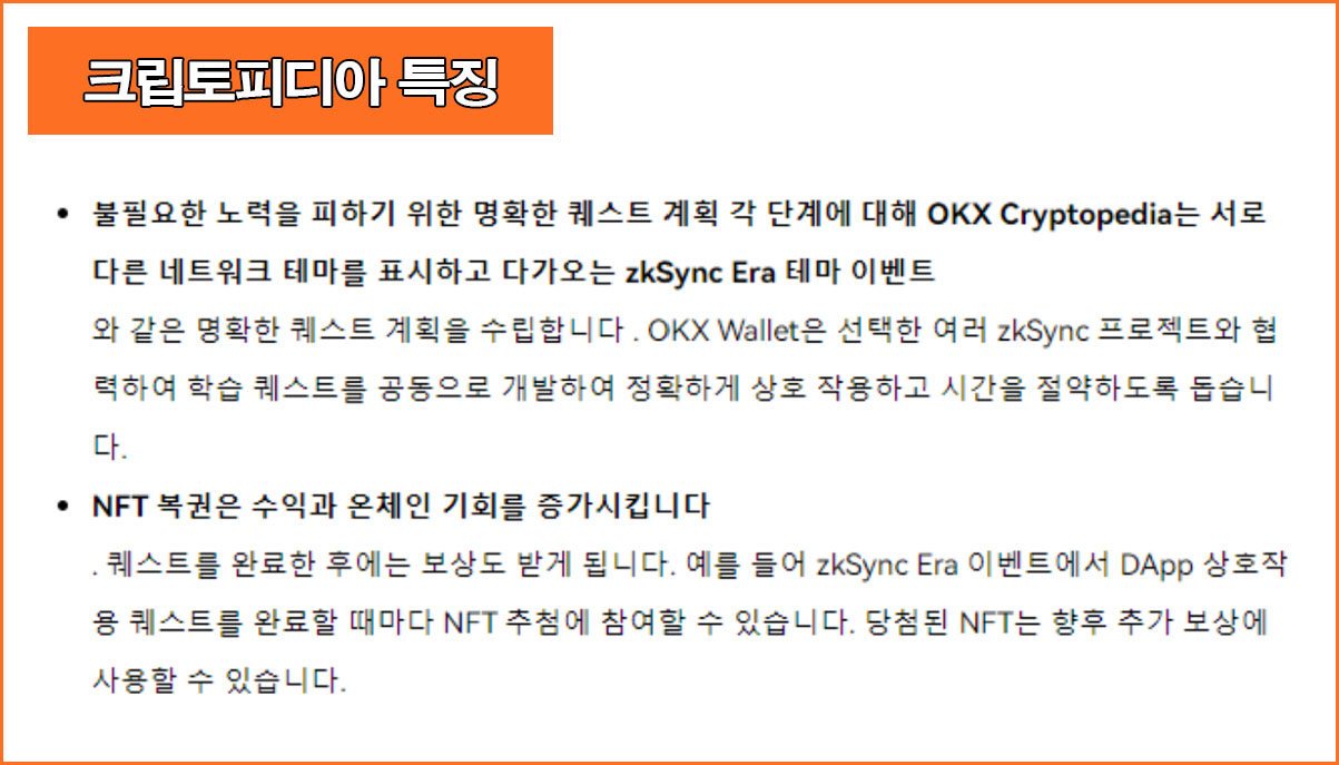 첫 번째는 효울성으로 zkSync같은 경우 각 단계에 대해 OKX Cryptopedia는 서로 다른 네트워크 테마를 표시하고 다가오는 zkSync Era 테마 이벤트를 진행한다.