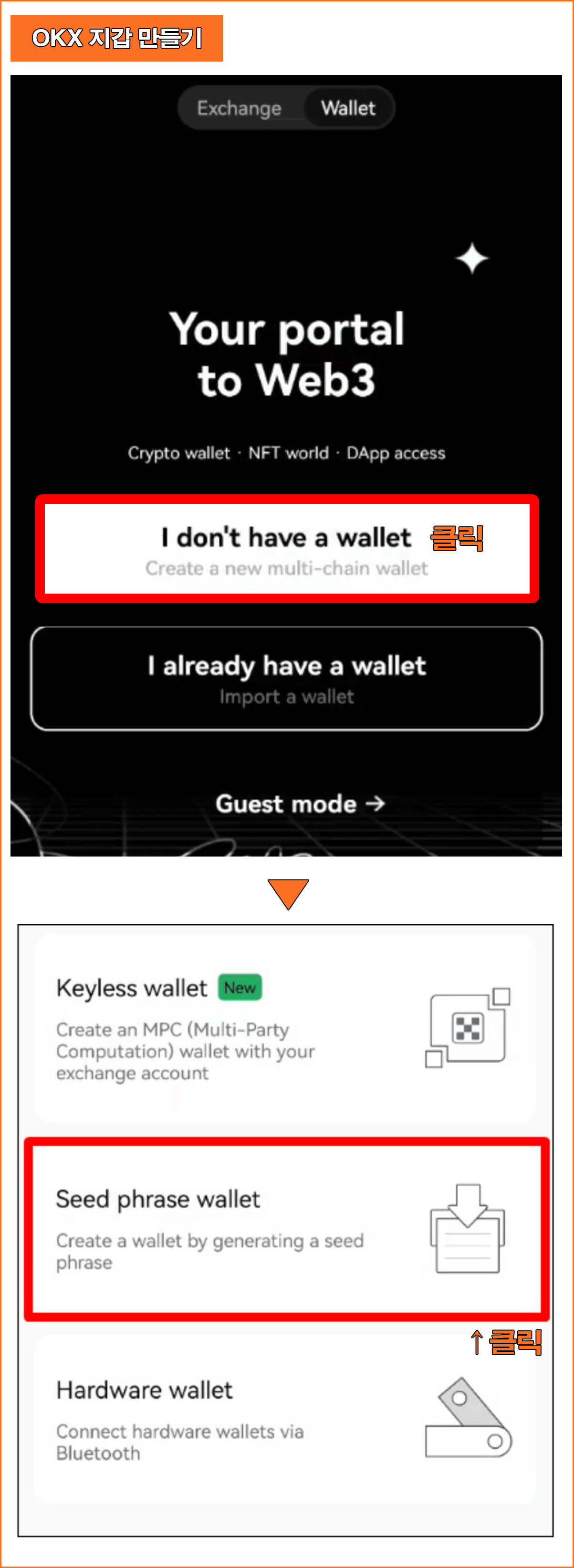 → OKX 어플 상단의 Wallet 탭을 클릭 후 "I don't have a wallet 버튼을 클릭한 후 지갑 생성 페이지로 이동한다.