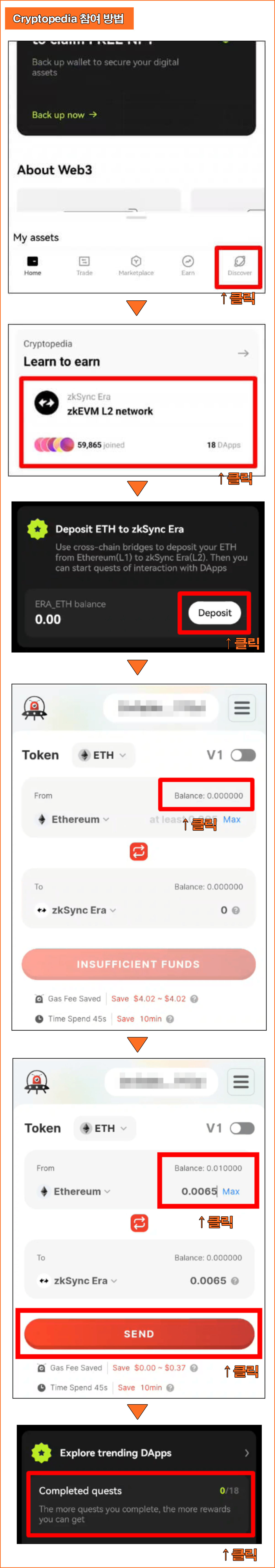 → 참가 자격이 생기면 퀘스트를 하나하나 깨면서 참가할 수 있다. 퀘스트를 진행하려면 지갑에 이더리움이 있어야하기 때문에 이더리움 부터 입금해야한다.