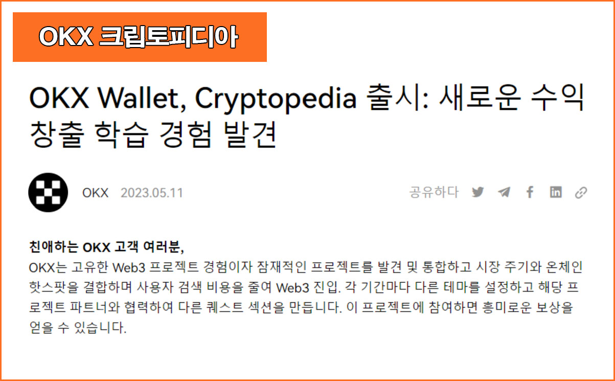 즉 크립토피아는 OKX wallet에서 주요 프로젝트들과 협력하여 사용자로 하여금 관련 이벤트에 참여해 에어드랍을 얻는 데 도움이 되게 만드는 것이다.