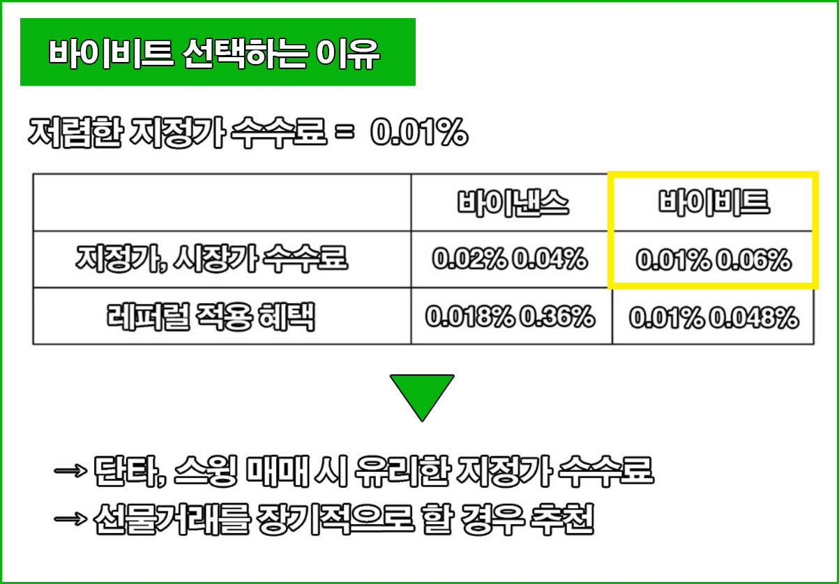 바이비트는 해외 암호화폐 거래소 업계 중 가장 저렴한 지정가 수수료가 장점이다. 0.01%으로 단타나 스윙 매매를 자주 한다면 지정가 수수료가 메리트가 크기 때문에 이런분들께는 바이비트 거래소를 추천하고 또한 선물 거래를 장기적으로 할 경우 수수료가 만만치 않기 때문에 추천한다.