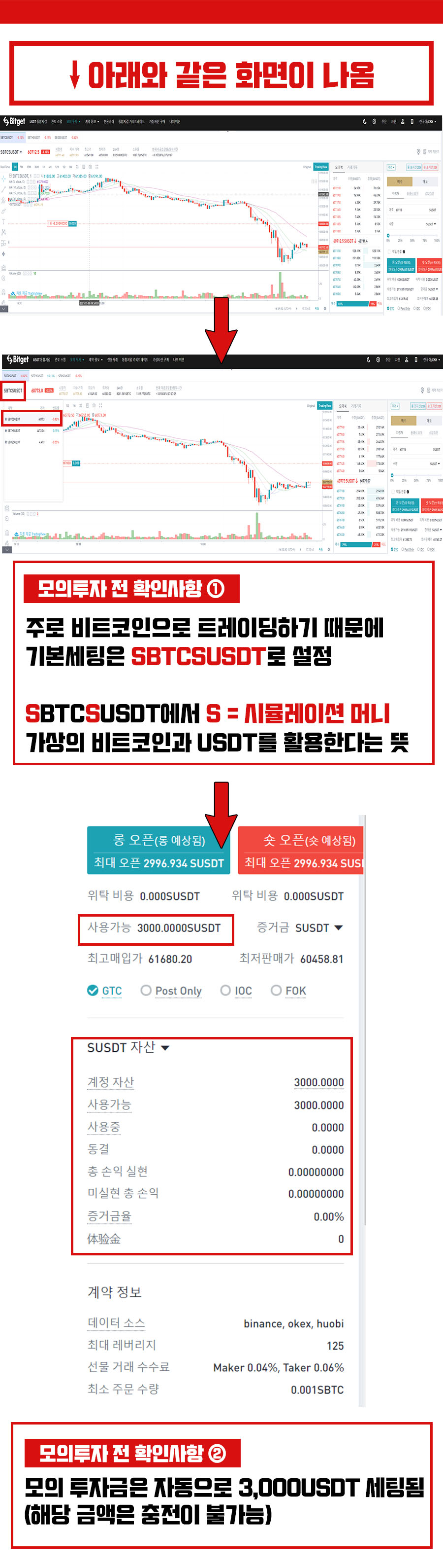 두번째, 모의투자금은 자동으로 3,000USDT가 세팅되고 이는 재충전이 불가하다. 다음은 모의투자를 통해 거래소 인터페이스를 이해하고 실전에서 활용할 수 있도록 하자.