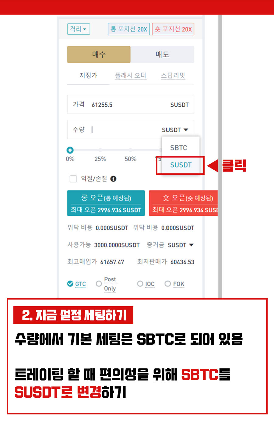 수량에서 기본 세팅은 SBTC로 세팅되어 있는데 트레이딩할 때 SBTC를 SUSDT로 변경한다.