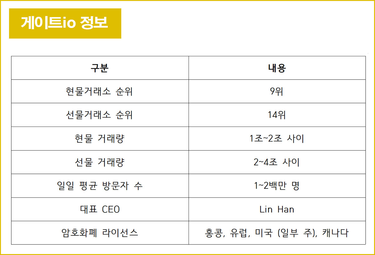 게이트아이오는 2013년에 설립되었으며 게이트테크놀로지에서 운영하고 있다. 전 세계 130개국 수백만 가입자들에게 100여 종이 넘는 코인거래 서비스를 제공하며 100여 종이 넘는 디지털 지갑을 제공하는 등 프리미엄 블록체인 자산 거래 및 투자 서비스를 제공한다.