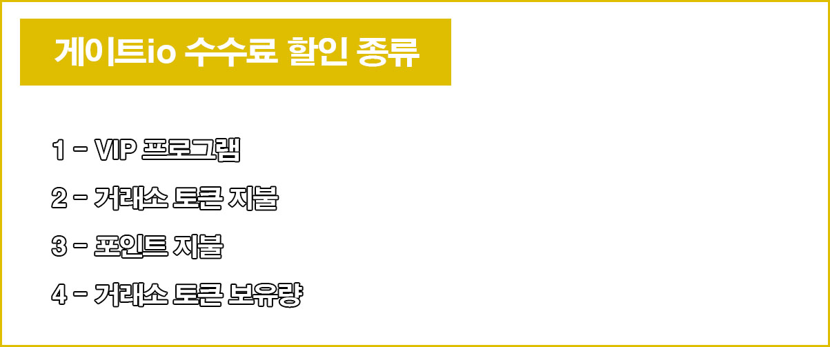 - 거래소 토큰 보유량 : 게이트아이오 거래소 토큰 보유량에 따라 수수료 할인 혜택을 제공받는다.