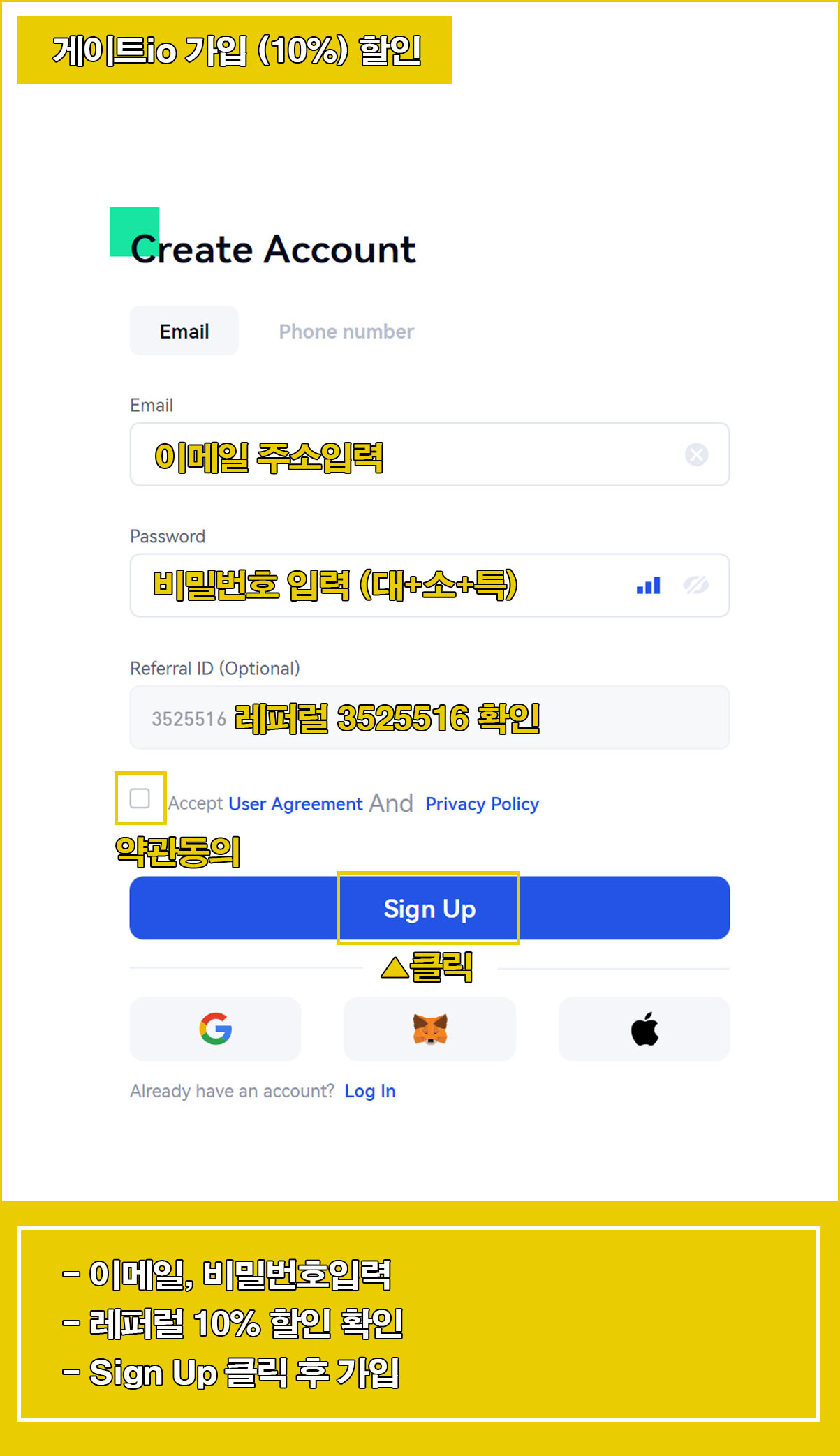링크를 통해 접속하면 자동으로 레퍼럴 ID 3525516이 입력되며 수수료 10% 할인 혜택을 받을 수 있다. 최초 가입 시에 입력해야만 할인혜택이 가능하기 때문에 ID,비밀번호 설정 후 레퍼럴 아이디를 한번 더 확인하자! 최종적으로 Sign up을 클릭하면 가입이 완료된다.