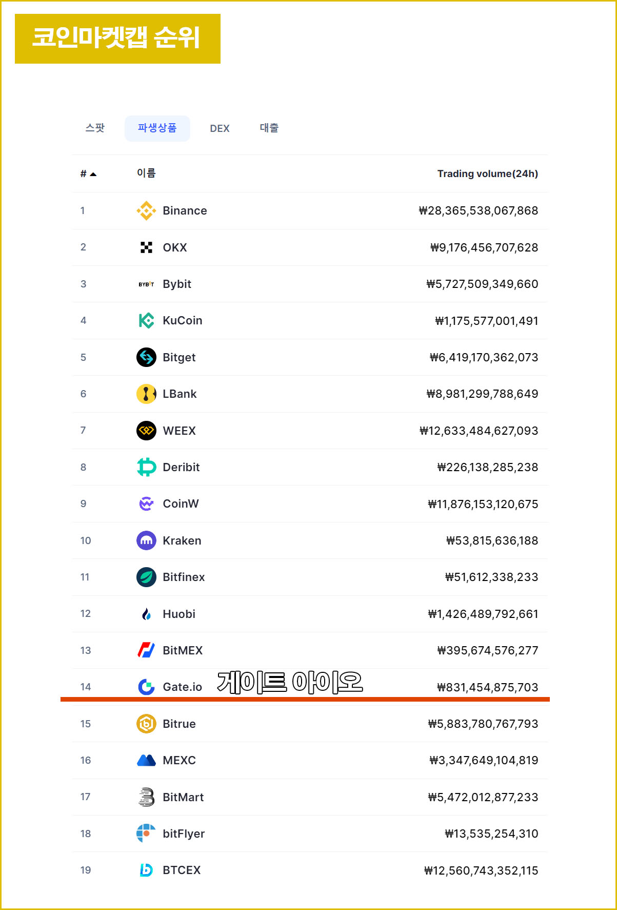게이트아이오는 코인마켓캡 파생상품 카테고리 14위로 20위권 안에 드는 메이저 거래소로 안전하게 이용가능하다.