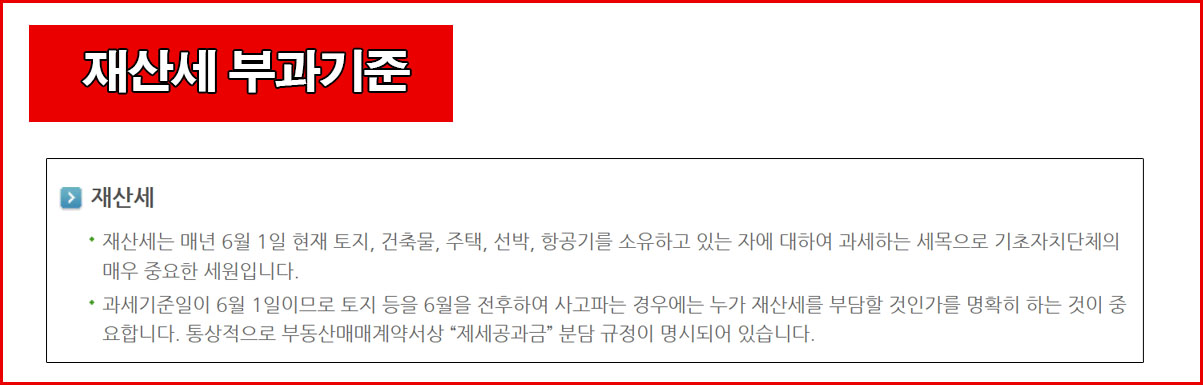 재산세는 매년 6월 1일 현재 토지, 건축물, 주택, 선박, 항공기를 소유하고 있는 자에 대하여 과세하는 세목이다. 6월을 전후하여 사고파는 경우에는 누가 재산세를 부담할 것인가를 명확히 하는 것이 중요하다.