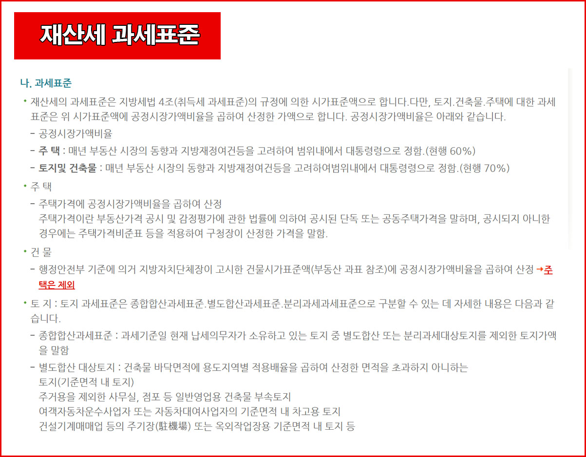 토지, 건축물, 주택의 과세표준은 시가표준액 X 공정시장가액비율이다. 선박이나 항공기의 경우에는 시가표준액이 과세표준이 되는 점 참고하면 된다.