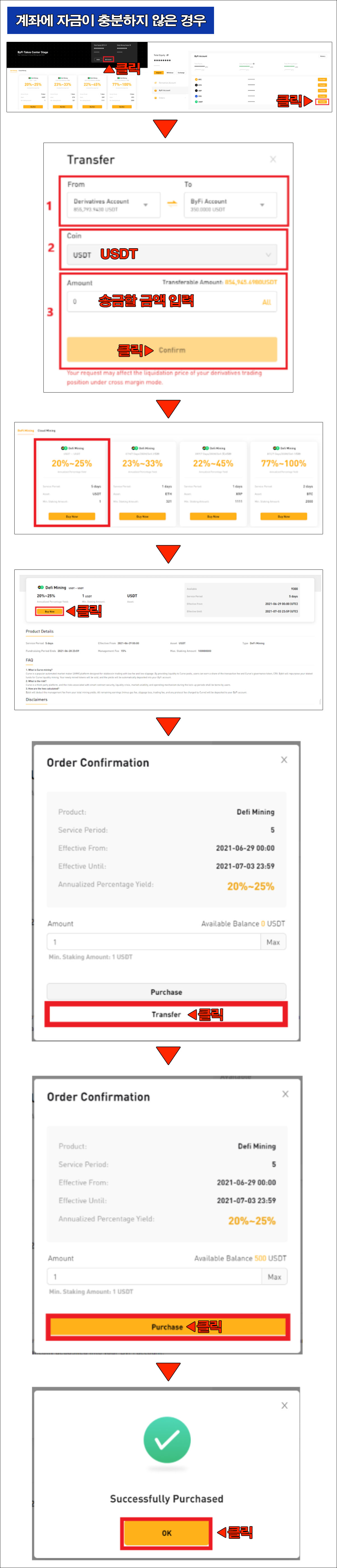 계정의 잔액이 부족한 경우에는 [Transfer]을 클릭하여 ByFi 계정을 채우는 단계를 진행하면 된다. 자금이 성공적으로 전송되면 제품 세부 정도 페이지로 돌아가 [Buy Now]를 다시 한번 클릭한다. 주문 정보를 확인 후 [Purchase]를 클릭한다. 여기까지 완료하면 주문이 성공적으로 이루어진다.